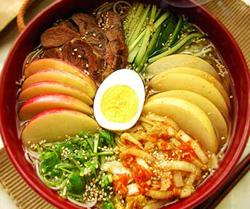 朝鲜冷面又称长寿面,是朝鲜族著名特色主食。原是朝鲜族节日、婚宴、寿诞等喜庆日子里必备的主食。冷面是以荞麦面粉和马铃薯粉制成的面条,配以特制的汤汁、熟牛肉、鸡蛋、泡菜、香菜等制作而成。